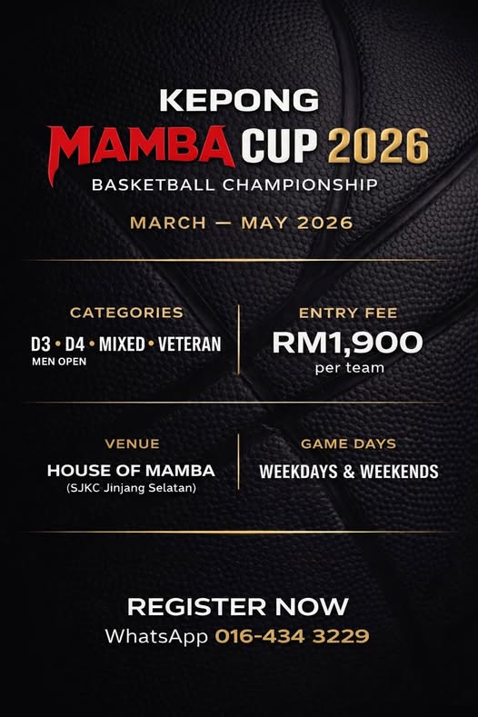 Last year, many teams came together at House of Mamba and created an amazing basketball atmosphere filled with friendship, sportsmanship and community spirit Because of your strong support, we are proud to bring it back for Year 2. 28 March 2026 onwards House of Mamba (SJKC Jinjang Selatan) RM1,900 per
